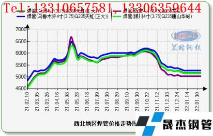 一月份(1.01-1.31),西北地區焊管鍍鋅管價格繼續下跌。云商平臺監測數據顯示,截至2022年1月31日,西安地區4寸(3.75mm)焊管價格為5000-5030元,與上月同期價格持平;蘭州地區4寸(3.75mm)焊管價格為5150-5170元,比上月同期價格下跌50元;銀川地區4寸(3.75mm)焊管價格為5130-5150元,比上月同期下跌50元;烏魯木齊地區4寸(3.75mm)焊管價格為5190-5270元,比上月同期下跌50元。西安地區4寸(3.75mm)鍍鋅管價格為5900-6070元,比上月同期價格下跌140-240元;蘭州地區4寸(3.75mm)鍍鋅管價格為5880-6000元,比上月同期價格下跌50元;銀川地區4寸(3.75mm)焊管價格為5940-6000元,比上月同期下跌50元;烏魯木齊地區4寸(3.75mm)焊管價格為6260-6280元,比上月同期上漲40元。
