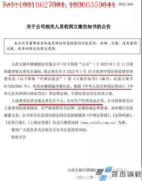 根據1月12日晚間,太鋼不銹發布的公告,公司董事柴志勇先生于2022年1月10日收到中國證券監督管理委員會的《立案告知書》(編號:證監立案字0172022001號),因其涉嫌泄露內幕信息,根據《中華人民共和國證券法》、《中華人民共和國行政處罰法》等法律法規,中國證監會決定對其立案。