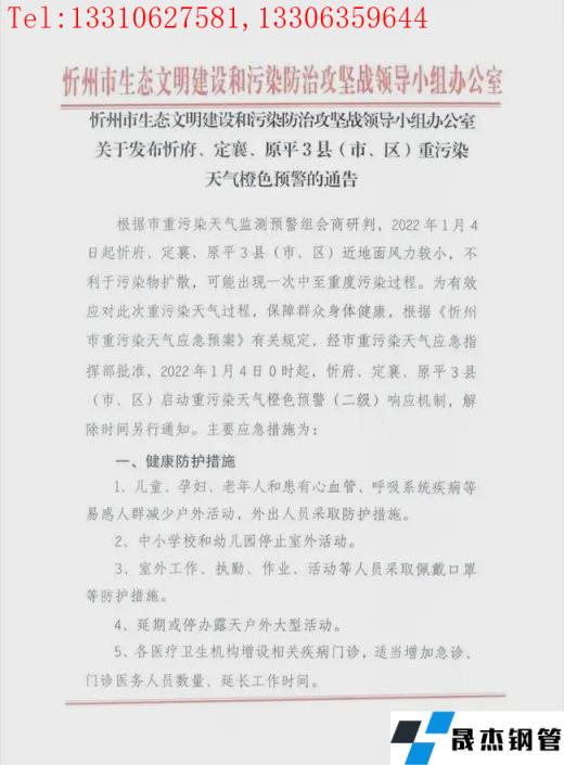 根據(jù)忻州市重污染天氣監(jiān)測預(yù)警組會商研判,2022年1月4日0時起 ,忻府、定襄、原平3縣(市、區(qū))啟動重污染天氣橙色預(yù)警(二級)響應(yīng)機制,解除時間另行通知。相關(guān)強制性污染減排措施為: