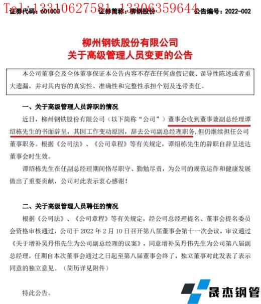 2月10日,柳州鋼鐵股份有限公司發布關于高級管理人員變更的公告。公告顯示,柳鋼股份董事會收到董事兼副總經理譚紹棟的書面辭呈,其因工作變動原因,辭去柳鋼股份副總經理職務,但仍繼續擔任柳鋼股份董事職務。