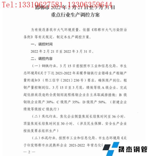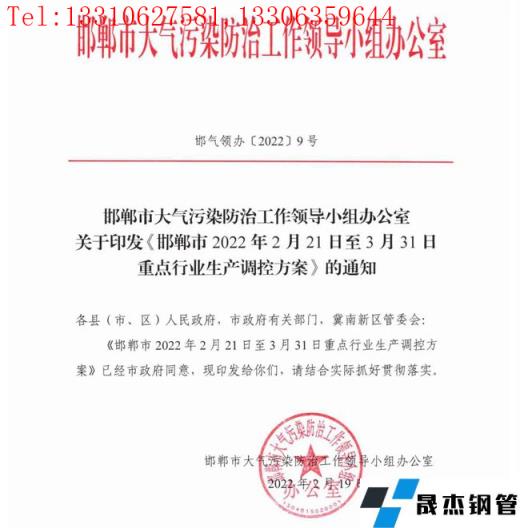 日前,邯鄲市大氣污染防治工作領導小組辦公室印發了《邯鄲市2022年2月21日至3月31日重點行業生產調控方案》。方案中對2022年2月21日至3月31日時段內的鋼鐵、焦化、水泥、獨立球團、鑄造、炭素等重點行業開展停限產措施。