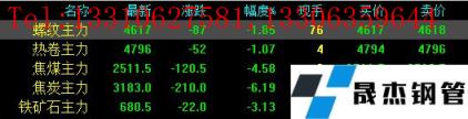 今日螺紋主力期貨跌87,收?qǐng)?bào)4617,跌幅1.85%;熱卷主力跌52,收?qǐng)?bào)4796,跌幅1.07%;焦煤主力跌120.5,收?qǐng)?bào)2511.5,跌幅4.58%;焦炭主力跌210,收?qǐng)?bào)3183,跌幅6.19%;鐵礦石主力跌22,收?qǐng)?bào)680.5,跌幅3.13%。