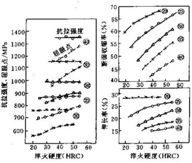 40Cr鋼經過830℃加熱在不同淬火冷卻速度下獲得不同層淬火硬度后,通過不同的淬火溫度,回火得到不同的回火硬度,然后進行拉伸試驗。結果表明,抗拉強度取決于最后回火硬度,幾乎不受淬火硬度的影響;而屈服度強度、伸長率和斷面收縮率不僅取決于回火硬度,也與淬火硬度有很大關系,在回火得到相同硬度的條件下,這些性能指標隨淬火硬度的升高而提高。因此,淬火回火工件不能只控制其回火后的硬度,還應檢驗淬火后的硬度,以便檢查工件淬火是否充分,不充分的淬火,在大多數時候應作為熱處理缺陷重新返工處理。