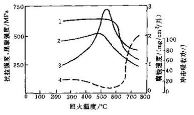 ▲圖5回火溫度對2Cr13性不銹鋼性能的影響1-抗拉強度2-屈服強度 3-20℃NaCl 3%水溶液中的腐蝕率4-艾氏沖擊韌度