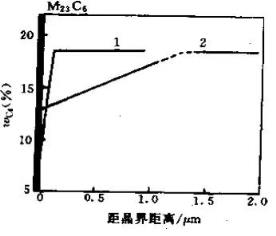 2.2.6脫碳的影響 滲碳工件在緩冷期和重新加熱淬火期間,由于溫度連續變化,氣氛碳勢和滲碳工件表面碳的質量分數不可能達到平衡。當氣氛碳勢低于滲碳表面的碳的質量分數時,滲碳工件表面發生脫碳。脫碳層的顯微組織取決于表層的碳的質量分數及淬火冷卻速度,當表層僅有輕微脫碳時,有可能降低表層殘余奧氏體含量,表層硬度下降很少甚至略有提高;嚴重的脫碳將使表層出現非馬氏體組織,降低表層硬度,使表層呈現殘余拉應力狀態,使疲勞強度下降。試驗表明,0.22mm的脫碳層使Cr-3%Ni鋼的彎曲疲勞強度降低40%。當CrMnTi鋼的滲碳層由于脫碳使其硬度下降到41~42HRC時,疲勞極限下降50%。三、耐腐蝕性能不良 在腐蝕性環境中工作的零件大多用不銹鋼制造。不銹鋼是含鉻超過5%的鐵基合金的總稱。但要從真正耐腐蝕的角度看,鋼中鉻的含量(w)必須超過10%。不銹鋼的耐腐蝕性來自于其中的鉻,這歸因于不銹鋼的表面能形成一層稱為鈍化膜的耐腐蝕的富鉻薄膜,由水化鉻酸CrxOx(OH)8x-2·nH2O組成。鉻的質量分數越高。鈍化膜中相對鉻含量越多。耐腐蝕性越好。不銹鋼按其金相組織分為馬氏體不銹鋼、鐵素體不銹鋼、奧氏體不銹鋼、鐵素體-奧氏體不銹鋼和沉淀硬化不銹鋼五類,鉻在不銹鋼中分布不均勻將導致其耐腐蝕性下降,熱處理影響鉻在不銹鋼中的分布,因而熱處理也極大的影響不銹鋼的耐蝕性。2Cr13型馬氏體不銹鋼若回火溫度選擇不當,在450℃~600℃回火時,由于Cr23C6型碳化物沿晶界析出,導致晶界附近局部鉻貧化,腐蝕抗力大幅度下降,如圖5 所示。