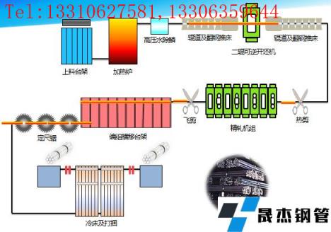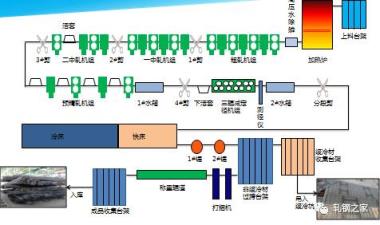 加熱爐、高壓水除鱗、軋機、輪廓儀或測徑儀、剪或鋸、熱打印機、冷床、矯直機、編組臺架、碼垛臺架、打捆機、稱重設備、噴標等設備