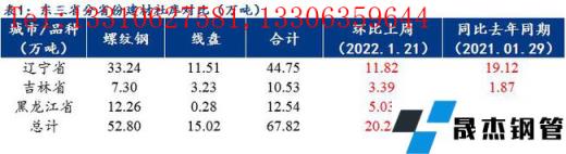 本周東三省建筑鋼材現(xiàn)貨庫存增加較多,增幅明顯超上周,其中螺紋鋼現(xiàn)貨庫存52.8萬噸,線盤15.02萬噸,建材社會(huì)庫存總量為67.82萬噸,較上周增20.24萬噸,增幅高達(dá)42.54%。隨著春節(jié)的臨近,北方下游終端工程進(jìn)入全停工狀態(tài),需求已無,出貨趨零,加之各個(gè)無縫鋼管廠家廠庫前移至市場各倉庫的現(xiàn)貨相對較多,社庫開始大幅度累庫。