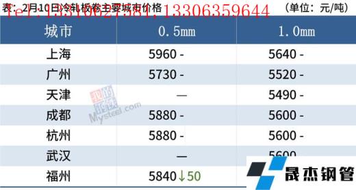 冷軋板卷:2月10日,全國24個主要城市1.0mm冷卷均價5593元/噸,較上個交易日下跌1元/噸。今日黑色系期貨盤面整體呈低開高走的態(tài)勢,在期貨盤面的影響下,午后市場詢單人數(shù)明顯增加,但由于下游客戶觀望情緒較為濃厚,今日整體成交一般。庫存方面,據(jù)不完全統(tǒng)計,現(xiàn)冷軋無縫厚壁鋼管廠家?guī)齑?3.71萬噸,周環(huán)比增加0.5萬噸,社會庫存139.17萬噸,周環(huán)比增加5.47萬噸,周消費量67.89萬噸,環(huán)比減少1.26萬噸。綜合來看,故預(yù)計11日國內(nèi)冷軋板卷價格或?qū)⒄鹗庍\行。