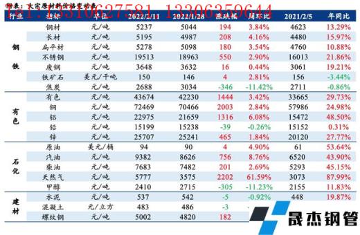 免責聲明:本網站(山東聊城晟杰無縫鋼管廠www.nfboat.cn)刊載的“周報:大宗原材料價格周報(2.07-2.11)”等均源于網絡,版權歸原作者所有,且僅代表原作者觀點,本文所載信息僅供參考。轉載僅為學習與交流之目的,如無意中侵犯您的合法權益,請及時聯系刪除。本網站刊登此篇文章并不意味著本站贊同其觀點或證實其內容的真實性,我們不對其科學性、嚴肅性等作任何形式的保證。如果侵犯了您的版權,請盡快聯系我們予以撤銷,謝謝合作!