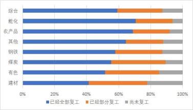 從未復工的企業調研情況來看,截至2月11日,計劃在2月7日-13日(節后第一周)復工的企業占比11.5%,計劃在2月14日-29日(節后第二周)復工的企業占比17.6%。預計節后兩周內,超九成企業都將完成復工,鋼鐵、能化、農產品行業企業復工率預計達到93%以上。
