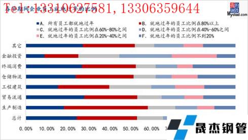 根據(jù)3805家企業(yè)的調(diào)研情況,今年用工和去年相比略微緊張一些。在崗員工較實(shí)際需要存在較大缺口(超過10%)的企業(yè)占比為10.35%,較去年上升了1個(gè)百分點(diǎn);在崗員工較實(shí)際需要存在一定缺口(5%-10%)的占比31.12%,較去年上升了2.5個(gè)百分點(diǎn);在崗員工與實(shí)際需要基本匹配的比例為54.01%,較去年同期下降了4.8個(gè)百分點(diǎn),在崗員工明顯超過實(shí)際需要(5%-10%)的比例為3.02%、在崗員工大幅超過實(shí)際需要(超過10%)的比例為1.50%。調(diào)研數(shù)據(jù)表明,今年鋼鐵行業(yè)企業(yè)用工有一定的缺口,節(jié)后多數(shù)企業(yè)可能擴(kuò)大人員規(guī)模;分類型來看,工程建筑也的用工缺口最大,其次為生產(chǎn)制造、金融投資兩個(gè)領(lǐng)域。