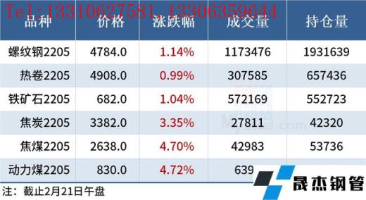 免責聲明:本網站(山東聊城晟杰無縫鋼管廠www.nfboat.cn)刊載的“2022年02月21日午報:鋼價多數上漲,黑色期貨集體飄紅”等均源于網絡,版權歸原作者所有,且僅代表原作者觀點,本文所載信息僅供參考。轉載僅為學習與交流之目的,如無意中侵犯您的合法權益,請及時聯系刪除。本網站刊登此篇文章并不意味著本站贊同其觀點或證實其內容的真實性,我們不對其科學性、嚴肅性等作任何形式的保證。如果侵犯了您的版權,請盡快聯系我們予以撤銷,謝謝合作!
