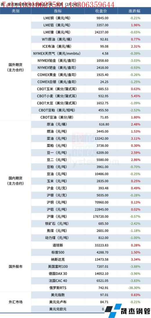 免責聲明:本網站(山東聊城晟杰無縫鋼管廠www.nfboat.cn)刊載的“受近期局勢影響大宗商品價格一覽表(2月24日)”等均源于網絡,版權歸原作者所有,且僅代表原作者觀點,本文所載信息僅供參考。轉載僅為學習與交流之目的,如無意中侵犯您的合法權益,請及時聯系刪除。本網站刊登此篇文章并不意味著本站贊同其觀點或證實其內容的真實性,我們不對其科學性、嚴肅性等作任何形式的保證。如果侵犯了您的版權,請盡快聯系我們予以撤銷,謝謝合作!