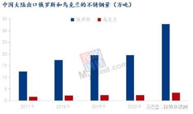 從中國海關(guān)數(shù)據(jù)了解到,中國大陸出口俄羅斯和烏克蘭的不銹鋼量呈上漲趨勢,2021年出口至俄羅斯的量約32.77萬噸(約為中國大陸出口總量的7.3%),同比增加68.3%;出口烏克蘭的量約3.46萬噸(約為中國大陸出口總量的0.8%),同比增加44.9%。