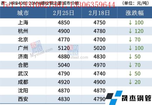 截至2月25日,全國主要城市20mm三級抗震螺紋鋼均價4869元/噸,周環比下跌53元/噸;8.0mmHPB300高線均價5067元/噸,周環比下跌58元/噸。