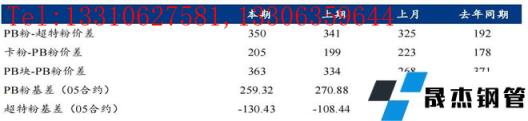 價差方面:本周高低品價差擴大,截至周五青島港PB粉與超特粉價差350元/噸,環比擴大9元/噸;巴西礦溢價減少,青島港卡粉與PB粉價差205元/噸,環比收窄6元/噸;粉塊價差收窄,青島港PB塊與PB粉價差363元/噸,環比收窄29元/噸。期現基差方面:PB粉基差259.32,環比走弱11.56;超特粉基差-130.43,環比走弱21.99。