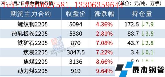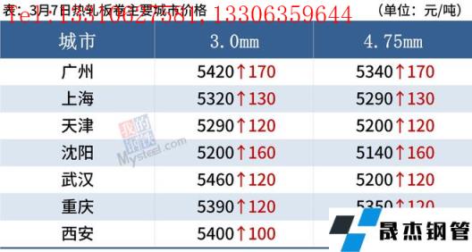 熱軋板卷:3月7日,全國24個主要城市4.75mm熱軋板卷均價5289元/噸,較上個交易日上漲111元/噸。由于對能源供應(yīng)的擔(dān)憂,大宗商品類品種普遍抬升,雙焦、鐵礦石等原料端的上漲帶動了成品材的價格上漲,成本支撐強勁。同時,俄羅斯熱卷出口限制,供應(yīng)的擔(dān)憂再一次推動了熱卷價格的上漲,明顯帶動國內(nèi)價格的上漲。8日全國熱軋板卷價格或?qū)⑿》鹗幧闲小?/p>