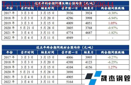 3月4日和5日,全國(guó)政協(xié)十三屆五次會(huì)議和十三屆全國(guó)人大五次會(huì)議先后在北京開幕。整理了過(guò)去五年兩會(huì)期間建筑厚壁無(wú)縫鋼管價(jià)格和庫(kù)存的數(shù)據(jù)變化。