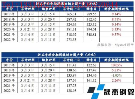 近五年兩會(huì)期間建筑厚壁無(wú)縫鋼管價(jià)格基本呈現(xiàn)下行趨勢(shì),2017年和2018年價(jià)格下行的主要原因是下游需求不振;2019年價(jià)格上漲的主要原因是限產(chǎn)加嚴(yán)導(dǎo)致供給偏低疊加下游需求恢復(fù)良好;2020年和2021年價(jià)格走低的主要原因是兩會(huì)期間建筑厚壁無(wú)縫鋼管產(chǎn)量高位運(yùn)行,供大于求。今年兩會(huì)期間,產(chǎn)量和庫(kù)存都處于往年平均線之下,供應(yīng)量相對(duì)偏低,同時(shí)一季度市場(chǎng)需求不斷回暖,若需求恢復(fù)力度尚可,疊加國(guó)內(nèi)宏觀利好持續(xù)推進(jìn),預(yù)計(jì)“兩會(huì)期間”建筑厚壁無(wú)縫鋼管價(jià)格或?qū)⒗^續(xù)震蕩偏強(qiáng)運(yùn)行。