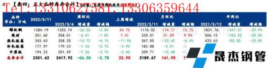 據(jù)統(tǒng)計,本周五大品種庫存總量為2351.62萬噸,環(huán)比上周減少66.3萬噸,其中建材庫存減少42.96萬噸,降幅為2.6%;板材庫存減少23.34萬噸,降幅3.2%。上期庫存總量為2417.92萬噸,環(huán)比上周增加22.9萬噸,其中建材庫存增加42.16萬噸,增幅為2.6%;板材庫存減少19.26萬噸,降幅2.5%。