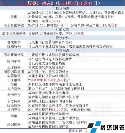 據不完全統計,本周(3月7日-3月11日)有2家無縫厚壁鋼管廠家發布檢修動態,具體如下:
