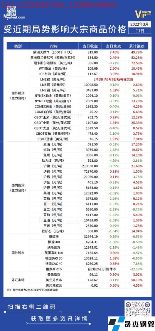 近期,受國(guó)際局勢(shì)影響,全球金融及大宗商品市場(chǎng)出現(xiàn)較大波動(dòng)。3月11日,商品及金融市場(chǎng)漲跌互現(xiàn),波動(dòng)幅度較前期明顯收窄。匯總情況如下: