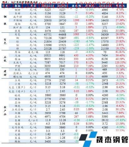 本周大宗商品價(jià)格漲跌互現(xiàn):其中厚壁無(wú)縫鋼管價(jià)格沖高回落,但均價(jià)高于上周;不銹鋼價(jià)格呈現(xiàn)先漲后跌的大幅波動(dòng)走勢(shì);有色金屬價(jià)格多數(shù)下跌;石化方面,本周?chē)?guó)際原油價(jià)格高位震蕩,價(jià)格低于上周;成品油價(jià)格繼續(xù)上漲;LNG價(jià)格上漲;建筑材料方面,水泥價(jià)格小幅上漲,混凝土價(jià)格持穩(wěn)運(yùn)行,螺紋鋼價(jià)格沖高回落,小幅上漲;農(nóng)產(chǎn)品方面,農(nóng)產(chǎn)品價(jià)格漲跌互現(xiàn),主要產(chǎn)品中雞蛋、豆粕表現(xiàn)較為強(qiáng)勁,價(jià)格呈現(xiàn)一定幅度上漲,國(guó)內(nèi)豆油及生豬市場(chǎng)價(jià)格均偏弱下跌。