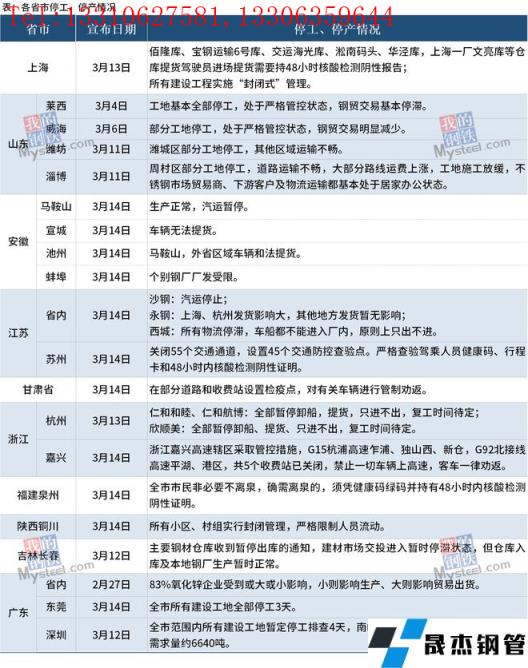 近期,全國疫情呈現(xiàn)局部高度聚集和多點散發(fā)態(tài)勢,對國內(nèi)大宗商品市場的供應(yīng)端、需求端、物流及倉儲等方面都有不同程度的影響。據(jù)統(tǒng)計,截至3月15日,全國多個省市發(fā)布停工停產(chǎn)情況。其中受疫情影響最大的吉林省于3月12日宣布,長春市主要厚壁無縫鋼管倉庫暫停出庫,當?shù)亟ú氖袌鼋煌哆M入暫時停滯狀態(tài),倉庫入庫及本地無縫厚壁鋼管廠家生產(chǎn)暫時正常。深圳市于3月12日宣布,全市范圍內(nèi)所有建設(shè)工地暫定停工排查4天,南山及福田區(qū)域厚壁無縫鋼管市場預(yù)計共影響需求量約6640噸。與此同時,全國其他地區(qū)鋼貿(mào)交易也受到影響,部分工地開始停工,物流運輸暫停服務(wù)。具體情況如下: