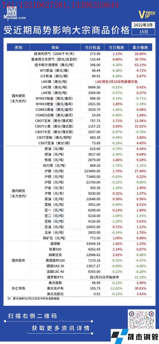 近期,受國際局勢影響,全球金融及大宗商品市場出現較大波動。3月15日,國際能源價格繼續大跌,WTI原油與布油均降至100美元以下。匯總情況如下: