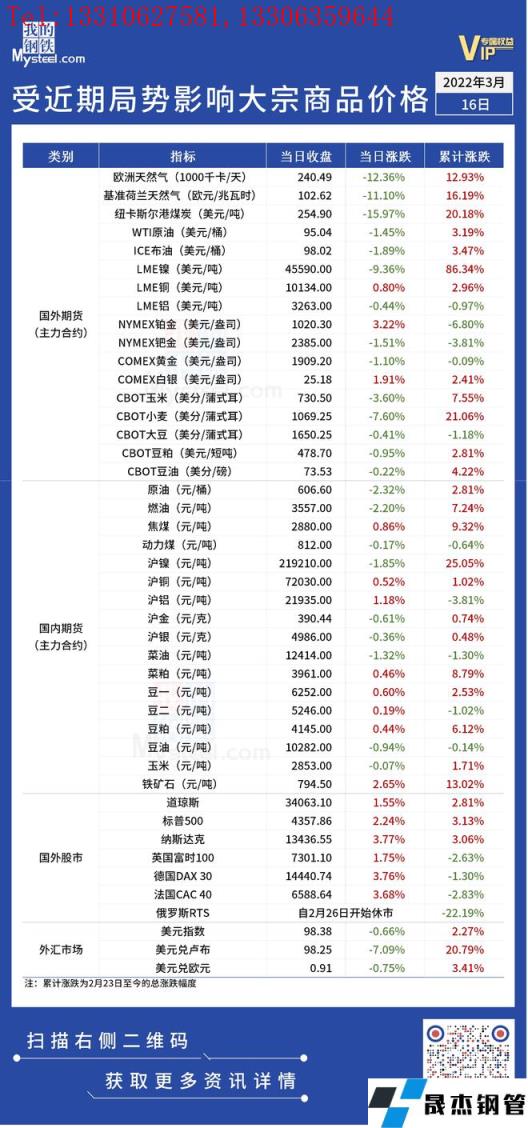 近期,受國際局勢影響,全球金融及大宗商品市場出現(xiàn)較大波動。據(jù)央視新聞報(bào)道,俄烏雙方準(zhǔn)備好了一份在烏克蘭保持中立、裁軍的前提下實(shí)施的停火撤軍計(jì)劃,國際能源價格繼續(xù)大跌。倫敦金屬交易所則宣布,將不會發(fā)布周三收盤價,因?yàn)殒噧r在收盤價確定期間處于跌停狀態(tài)。跌停價45590美元/噸將繼續(xù)用于LME清算所的保證金計(jì)算,以及周四漲跌停的基礎(chǔ)。另外,美聯(lián)儲加息如期而至,美國三大股指跌宕起伏走出V型反彈。匯總情況如下: