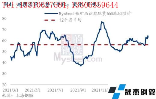 去年8-11月焦炭?jī)r(jià)格經(jīng)歷大幅度上漲之后,為控制成本無(wú)縫厚壁鋼管廠家開始下調(diào)塊礦的入爐配比,導(dǎo)致遠(yuǎn)期塊礦溢價(jià)最低跌至僅0.0265美元/干噸度,從而性價(jià)比凸顯,之后進(jìn)入四季度隨著采暖季的進(jìn)行,燒結(jié)限產(chǎn)加嚴(yán),導(dǎo)致燒結(jié)礦供應(yīng)不足,而此時(shí)球團(tuán)溢價(jià)又尚處于高位,因此無(wú)縫厚壁鋼管廠家在二者選擇中,最終使用性價(jià)比較高的塊礦用以彌補(bǔ)燒結(jié)礦不足的影響,帶動(dòng)塊礦需求好轉(zhuǎn),塊礦溢價(jià)開始走高;之后塊礦配比雖有下調(diào),但其配比仍處于歷史中高位水平,因此今年1至3月份塊礦溢價(jià)仍持續(xù)上漲。
