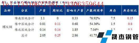 調(diào)研數(shù)據(jù)顯示,統(tǒng)計的河南地區(qū)10家建筑厚壁無縫鋼管樣本無縫厚壁鋼管廠家中,本周2家無縫厚壁鋼管廠家處于正常生產(chǎn),4家無縫厚壁鋼管廠家處于部分軋線停產(chǎn)檢修或不飽和生產(chǎn),其余4家處于停產(chǎn)生產(chǎn)狀態(tài)。從產(chǎn)量數(shù)據(jù)來看,目前河南地區(qū)10家樣本無縫厚壁鋼管廠家建筑厚壁無縫鋼管總?cè)站a(chǎn)量為2.66萬噸,較上周增加0.13萬噸。其中螺紋日產(chǎn)量為2.05萬噸,線盤日產(chǎn)量為0.61萬噸。從區(qū)域來看,豫南地區(qū)無縫厚壁鋼管廠家建筑厚壁無縫鋼管總?cè)债a(chǎn)量1.49萬噸,豫中地區(qū)無縫厚壁鋼管廠家建筑厚壁無縫鋼管總?cè)债a(chǎn)量1.03萬噸,豫北地區(qū)無縫厚壁鋼管廠家建筑厚壁無縫鋼管總?cè)债a(chǎn)量0.14萬噸。本周河南區(qū)域無縫厚壁鋼管廠家檢修/限產(chǎn)影響建材日產(chǎn)量為3.38萬噸,產(chǎn)能利用率為44.4%,本周產(chǎn)量繼續(xù)處于回升狀態(tài)。