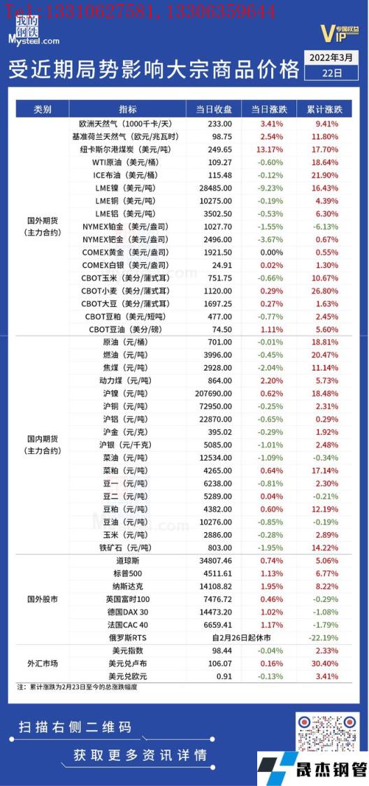 近期,受國際局勢(shì)影響,全球金融及大宗商品市場(chǎng)出現(xiàn)較大波動(dòng)。3月22日,國際油價(jià)、金屬普跌。匯總情況如下: