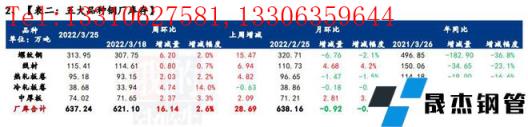 庫存方面,五大品種厚壁無縫鋼管總庫存節后第3周轉增,環比上周微增1.16萬噸,增幅0.05%。分品種看,建材庫存增加2.84萬噸,增幅為0.2%;板材庫存減少1.68萬噸,降幅0.2%;分指標看,五大品種無縫厚壁鋼管廠家庫存環比增加16.14萬噸,增幅2.6%;五大品種社會庫存環比減少14.98萬噸,降幅0.9%。