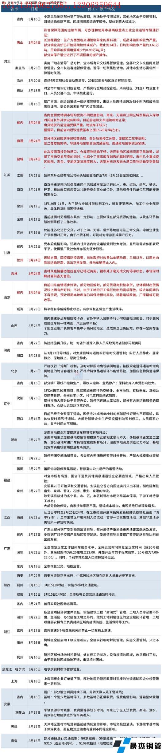 截至3月25日,匯總了20個省份停工復(fù)工最新信息。其中,河北唐山市符合保障范圍的運輸車輛,可辦理和使用市縣兩級重點工業(yè)企業(yè)運輸車輛通行證。江蘇南通部分地區(qū)已接到環(huán)保檢查通知,部分場地停工休整,廢鋼加工效率受阻。吉林從疫情靜態(tài)管控至3月24日將近兩周,鋼市處于毫無成交的停滯狀態(tài),市場何時解封目前杳無音信。具體情況如下: