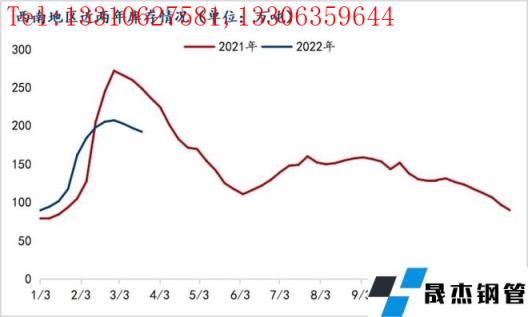 據(jù)西南地區(qū)近五年歷史庫(kù)存數(shù)據(jù)來(lái)看,庫(kù)存峰值基本在第三周或第四周出現(xiàn)(除去2020年疫情影響庫(kù)存峰值出現(xiàn)在第七周),節(jié)后累庫(kù)周期基本為2-3周,2022年西南地區(qū)建筑厚壁無(wú)縫鋼管峰值出現(xiàn)在第五周,累庫(kù)周期較往年長(zhǎng)。峰值過(guò)后第一周去庫(kù)4.41萬(wàn)噸,降幅2.13%,第二周去庫(kù)5.69萬(wàn)噸,降幅2.8%,較往年去庫(kù)速度偏緩慢。主要原因是:1、今年春節(jié)時(shí)間較往年靠前,受極端天氣影響,春節(jié)后西南地區(qū)經(jīng)歷兩次降溫降雪天氣,影響出貨節(jié)奏;2、西南地區(qū)下游回款進(jìn)度僅60%左右,下游資金緊張,影響項(xiàng)目施工節(jié)奏,據(jù)了解,西南地區(qū)多數(shù)新開工項(xiàng)目要延期至4月中旬以后。3、全國(guó)疫情再次擴(kuò)散,下游施工受阻;4、其他因素,運(yùn)費(fèi)上漲、貴州開啟施工項(xiàng)目安全大檢查等。綜上原因,西南地區(qū)建筑厚壁無(wú)縫鋼管庫(kù)存累庫(kù)周期長(zhǎng),去庫(kù)速度緩慢。