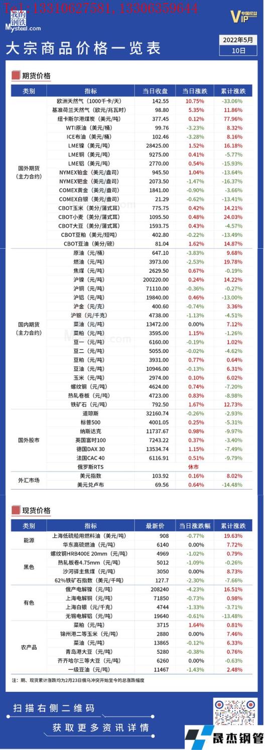 免責聲明:本網站(山東聊城晟杰無縫鋼管廠www.nfboat.cn)刊載的“俄烏局勢丨大宗商品價格一覽表(5月10日)”等均源于網絡,版權歸原作者所有,且僅代表原作者觀點,本文所載信息僅供參考。轉載僅為學習與交流之目的,如無意中侵犯您的合法權益,請及時聯系刪除。本網站刊登此篇文章并不意味著本站贊同其觀點或證實其內容的真實性,我們不對其科學性、嚴肅性等作任何形式的保證。如果侵犯了您的版權,請盡快聯系我們予以撤銷,謝謝合作!