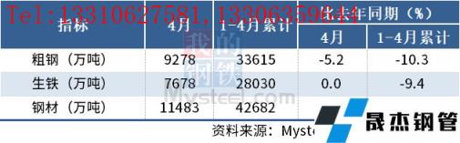 4月,中國粗鋼產(chǎn)量9278萬噸,同比下降5.2%;生鐵產(chǎn)量7678萬噸,同比持平;厚壁無縫鋼管產(chǎn)量11483萬噸,同比下降5.8%。