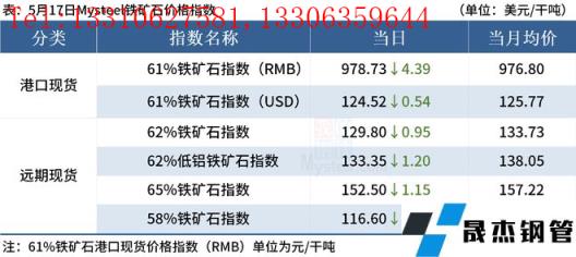 ◎5月17日,全國主港鐵礦石成交96.50萬噸,環比增40.9%;237家主流貿易商建材成交14.30萬噸,環比減17.5%。