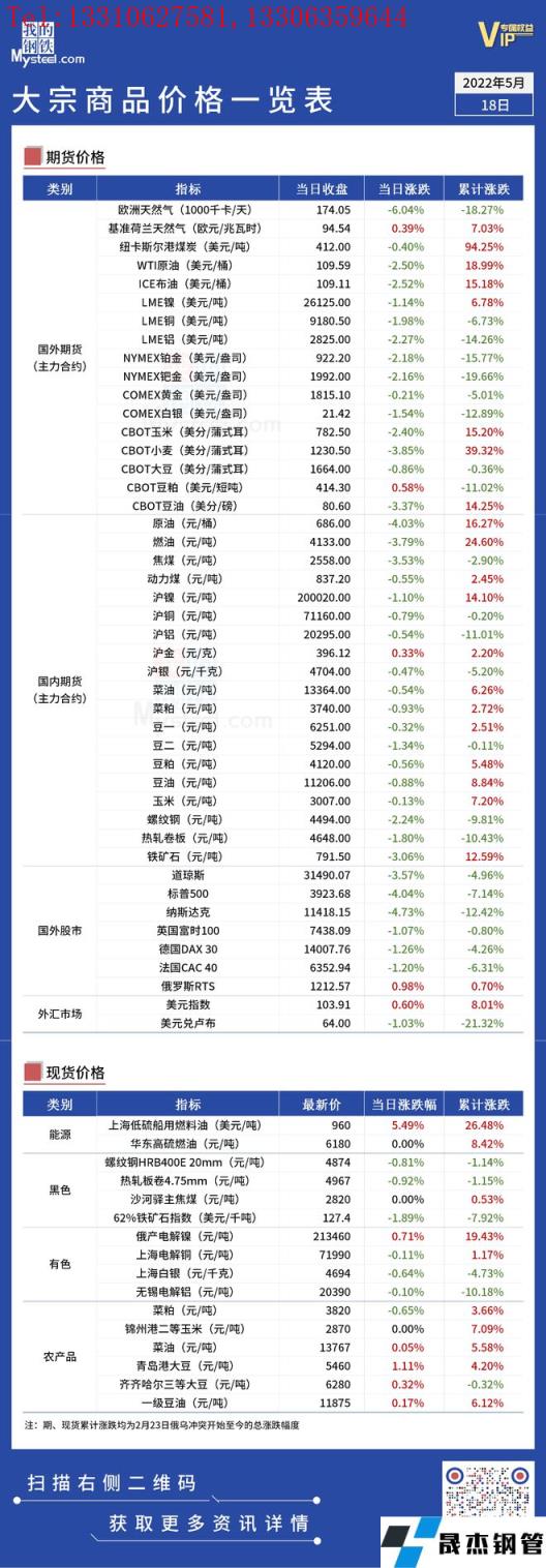 免責聲明:本網站(山東聊城晟杰無縫鋼管廠www.nfboat.cn)刊載的“俄烏局勢丨大宗商品價格一覽表(5月18日)”等均源于網絡,版權歸原作者所有,且僅代表原作者觀點,本文所載信息僅供參考。轉載僅為學習與交流之目的,如無意中侵犯您的合法權益,請及時聯系刪除。本網站刊登此篇文章并不意味著本站贊同其觀點或證實其內容的真實性,我們不對其科學性、嚴肅性等作任何形式的保證。如果侵犯了您的版權,請盡快聯系我們予以撤銷,謝謝合作!