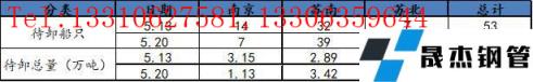 此次調(diào)研選取了南京、蘇州、無錫、常州、南通、徐州、揚(yáng)州、鹽城八個(gè)城市,以建筑厚壁無縫鋼管為主要庫存的20家倉庫。通過匯總了解,當(dāng)前樣本倉庫碼頭累計(jì)待卸船只總計(jì)53只,待卸總量達(dá)5.48萬噸。