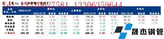 消費方面,本周五大品種周消費量降幅2.3%;其中建材消費環(huán)比增幅0.1%,板材消費環(huán)比降幅4.3%。