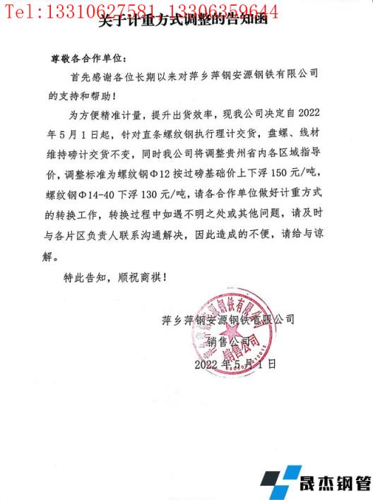 免責(zé)聲明:本網(wǎng)站(山東聊城晟杰無(wú)縫鋼管廠www.nfboat.cn)刊載的“萍鄉(xiāng)萍鋼安源鋼鐵有限公司關(guān)于對(duì)貴州區(qū)域計(jì)重方式調(diào)整的告知函”等均源于網(wǎng)絡(luò),版權(quán)歸原作者所有,且僅代表原作者觀點(diǎn),本文所載信息僅供參考。轉(zhuǎn)載僅為學(xué)習(xí)與交流之目的,如無(wú)意中侵犯您的合法權(quán)益,請(qǐng)及時(shí)聯(lián)系刪除。本網(wǎng)站刊登此篇文章并不意味著本站贊同其觀點(diǎn)或證實(shí)其內(nèi)容的真實(shí)性,我們不對(duì)其科學(xué)性、嚴(yán)肅性等作任何形式的保證。如果侵犯了您的版權(quán),請(qǐng)盡快聯(lián)系我們予以撤銷,謝謝合作!