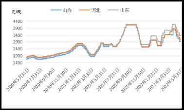 據(jù)云商平臺(tái)監(jiān)測(cè)數(shù)據(jù)顯示,截至5月31日,山西臨汾地區(qū)二級(jí)冶金焦含稅出廠價(jià)在2930元,較月初跌900元;唐山地區(qū)二級(jí)冶金焦含稅出廠價(jià)在3050元,較月初跌800元;山東淄博地區(qū)二級(jí)冶金焦含稅出廠價(jià)在3360元,較月初跌800元(詳見(jiàn)圖3)。