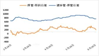 6月焊管較帶鋼價(jià)差由月初收至零軸后重新走擴(kuò),目前管廠廠內(nèi)原料輪換周期拉長(zhǎng)至15天左右,結(jié)算周期內(nèi)焊管生產(chǎn)利潤(rùn)平均虧損139元,架子管平均虧損129元;鍍鋅管較焊管價(jià)差擴(kuò)大96元,綜合生產(chǎn)利潤(rùn)有所改善,但整體仍處虧損邊緣。
