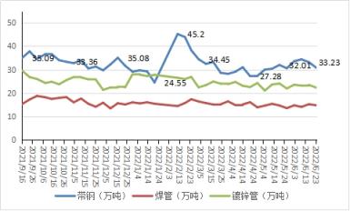 6月面臨美聯儲加息、國內宏觀經濟數據偏空雙重壓力,鋼市行情崩塌式探底,焊鍍管價格最高三天降幅達500元,需求傾向偏弱方向,但上游供應壓力不減,市場信心修復需要時間,行情持續(xù)壓制在低位運行。