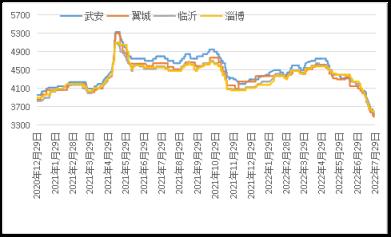 據(jù)云商平臺(tái)監(jiān)測(cè)數(shù)據(jù)顯示,截至7月29日,煉鋼生鐵天津地區(qū)報(bào)價(jià)3120元(噸價(jià),下同),較月初跌550元;唐山地區(qū)報(bào)價(jià)3150元,較月初跌550元;翼城地區(qū)報(bào)價(jià)3100元,較月初跌620元;臨沂地區(qū)報(bào)價(jià)3350元,較月初跌500元(詳見圖2)。