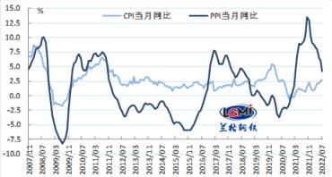 7月份,工業(yè)生產(chǎn)者出廠價(jià)格同比漲幅較上月回落1.9個(gè)百分點(diǎn),同比漲幅回落速度加快,環(huán)比自今年2月份以來首次下降,且降幅較大。海外主要經(jīng)濟(jì)體經(jīng)濟(jì)增速放緩,貨幣政策持續(xù)收緊,需求收縮壓力加大,后期PPI同比漲幅將保持回落趨勢(shì)。